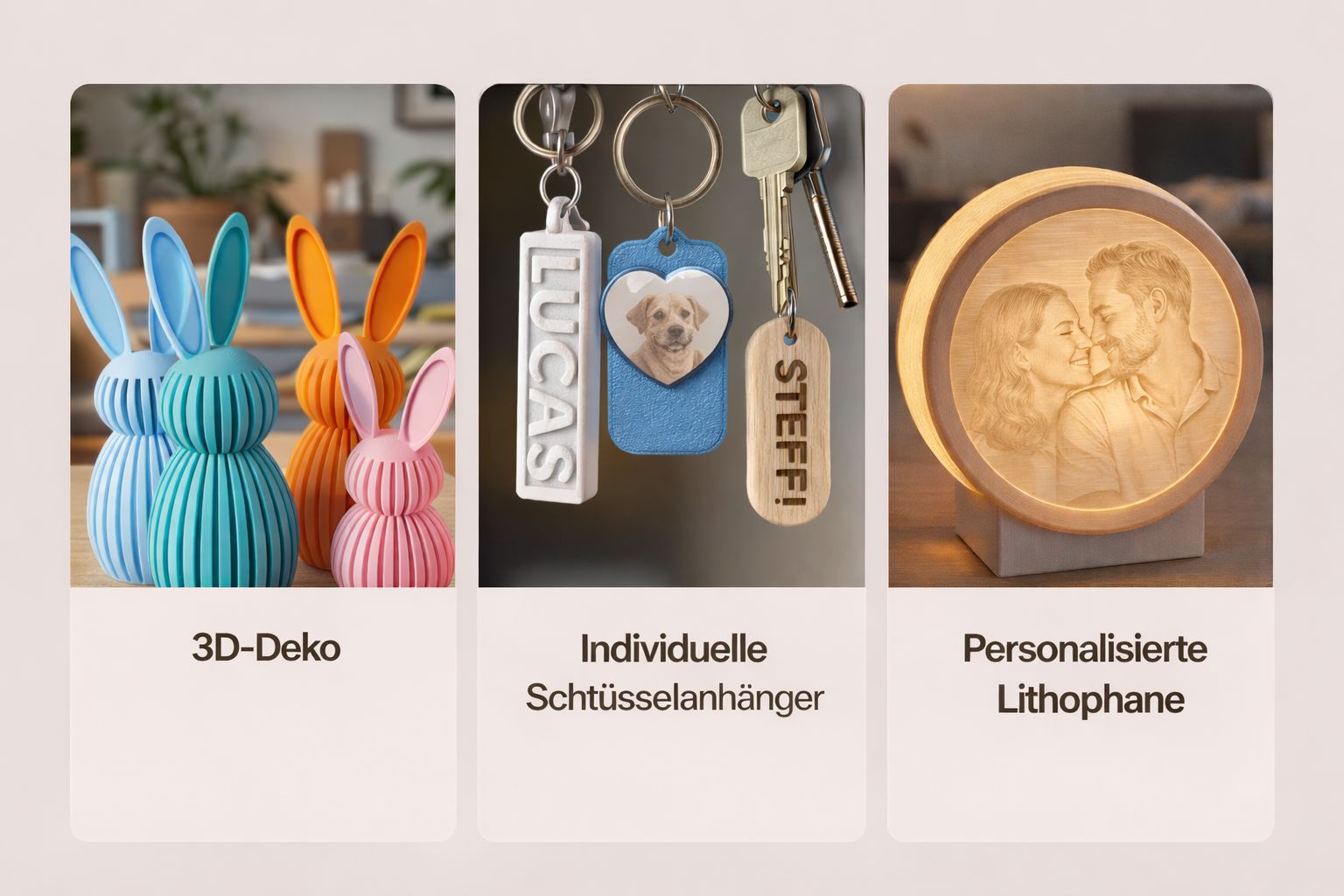 Von moderner 3D-Deko über individuelle Schlüsselanhänger bis hin zu personalisierten Lithophane mit Wunschmotiv – entdecken Sie kreative Produkte, die Erinnerungen sichtbar machen und Freude schenken.